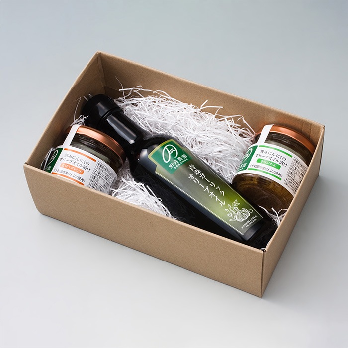 青森ガーリックオリーブオイル183g、刻みにんにくのオリーブオイル漬け オリジナル63g、刻みにんにくのオリーブオイル漬け ごぼうブレンド63g