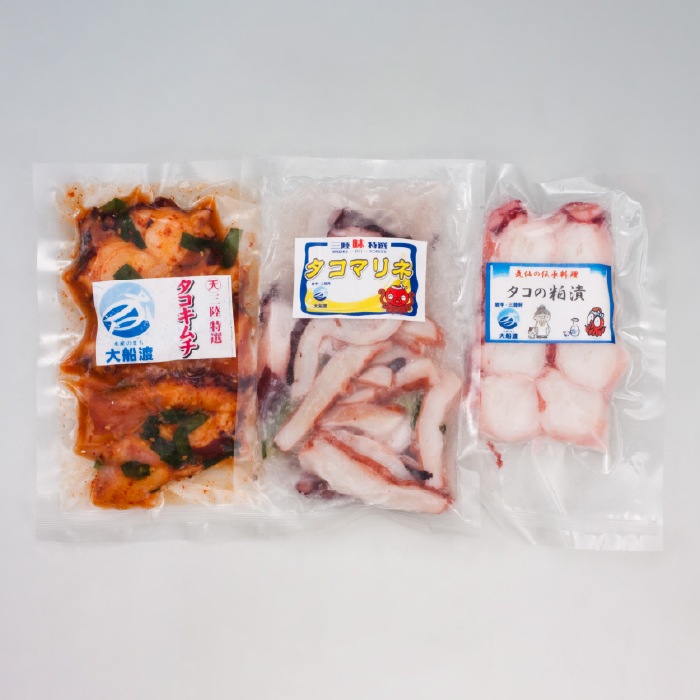 岩手三陸産の新鮮なタコを、個性豊かな3つの味に仕上げました。